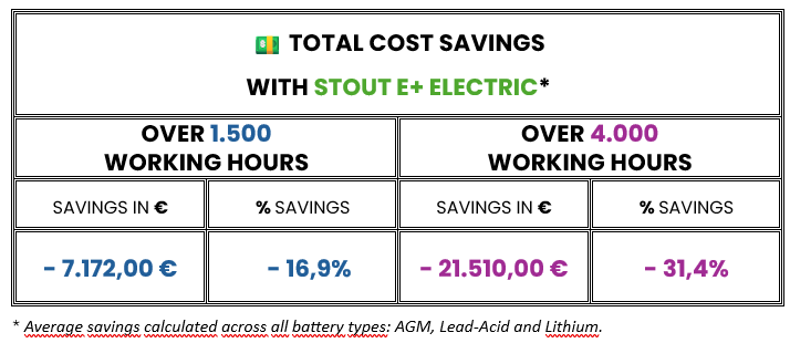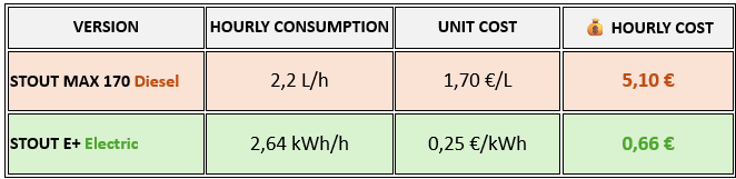 Nuestro análisis basado en el consumo real de energía y el costo promedio europeo de diesel por litro y electricidad por kWh revela una ventaja económica clara: La versión eléctrica STOUT E+ ahorra aproximadamente €4,44 por cada hora de trabajo en comparación con la versión diesel.